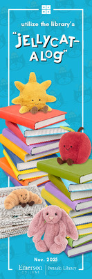 This limited-edition bookmark debuted for the Emerson community in early November 2025. Inspired by the wildly popular stuffed animal collectibles known as jellycats. On the front of the bookmark, some of the more well known jellycats are busy studying. Flip it over and enjoy fall-themed jellycats with some food and Thanksgiving related jellycats. Scan the QR code on the back to explore a full list of Iwasaki Library resources.