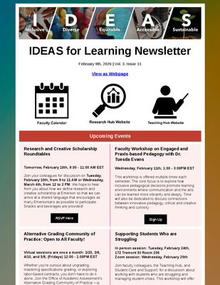 This IDEAS for Learning Newsletter reached the faculty of Emerson College on February 9th, 2026. This is the first published issue of February 2026. This is the eleventh issue of the third volume. It includes event reminders like Research and Creative Scholarship Breakfast Roundtable, Alternative Grading Community of Practice: Open to All Faculty, a faculty workshop on Engaged and Praxis-based Pedagogy with Dr. Tuesda Evans, Supporting Students Who are Struggling, Research Hub Writing Retreat, and a Spring Celebration of Research event. It also includes two spotlight stories about how co-curriculars benefit you and your students with Dr. Mneesha Gellman and Owen Eagan. Lastly, there’s a reminder about Let’s Talk Teaching on Wednesday 9/29 and Thursday 2/20.