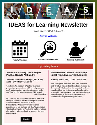 This IDEAS for Learning Newsletter reached the faculty of Emerson College on January 26th, 2026. This is the only published issue of January 2026. This is the tenth issue of the third volume. It includes event reminders like OAA & Teaching Hub Workshop: Assignment Design for Reduced Grading, a faculty workshop on Engaged and Praxis-based Pedagogy with Dr. Tuesda Evans, Teach-In on Timely Topic: Public Knowledge, Memory, and Legacy, AAC &U AI Workshop series, and a Spring Celebration of Research. It also includes a spotlight story on affiliated faculty member Ijeoma Nwankwo introducing students to the Harvard Business School Coffee Shop Simulation, Let’s Talk Teaching is back, Tools and Programs for Faculty Research and Scholarship, and an announcement that the Teaching Hub Website has launched. This newsletter includes top links like: the faculty calendar, research hub website, teaching hub website, and more.
