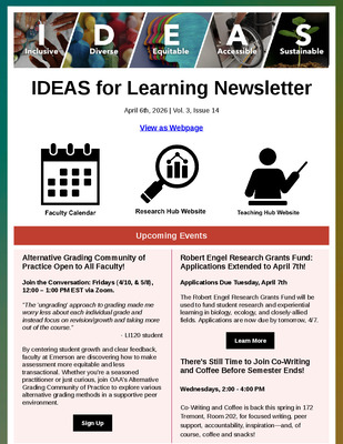 This IDEAS for Learning Newsletter reached the faculty of Emerson College on April 6th, 2026. This is the first published issue of April 2026. This is the fourteenth issue of the third volume. It includes event reminders like Alternative Grading Community of Practice: Open to All Faculty, Robert Engel Research Grants Fund Applications due 4/7, and Co-Writing and Coffee. Near the top is a support for your story with insights from the Academic Assessment Culture @ Emerson Survey which shows the difference in overall faculty and collaboration with OAA from 2021 compared to 2026. Our spotlight stories are on Emily Scherny's partnership with artists for humanity and Dr. Maryam Salehomum on communication efficacy for deaf or hard of hearing students. It features updated links for last issue's stories on Paul Turano’s Mind Mapping Written Assignments into Visual Art and Dr. Danielle Drees’s Verbal Midterm Exam. Lastly, there are stories on opportunities for faculty like Equity and Access Through Open Educational Resources: A Funded Opportunity for Professional Development, a call for Alumni Award for Teaching Innovation, and help with planning a human subjects research study with Emerson Institutional Review Board. The bottom of the newsletter includes a link to other newsletters which is located on Digital Commons.