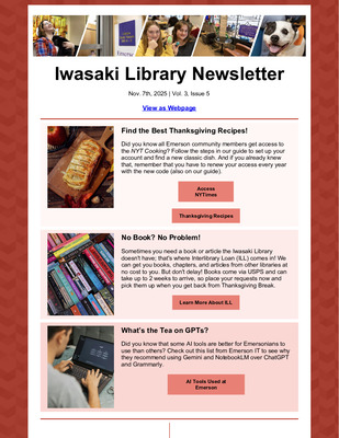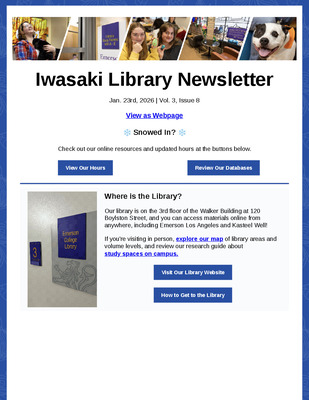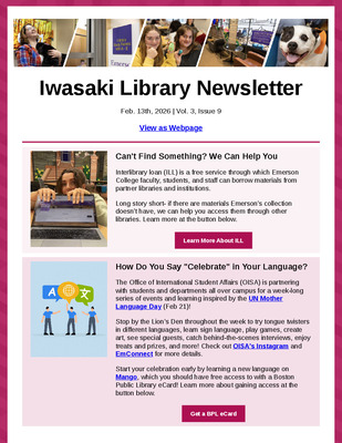 The Library Newsletter informs the Emerson College community—students, staff, and faculty—about the Iwasaki Library's upcoming events, access details, free resources, and more. This newsletter's goal is to highlight the Library's extensive offerings and increase awareness of its valuable resources to foster a culture of curiosity and knowledge within our community.